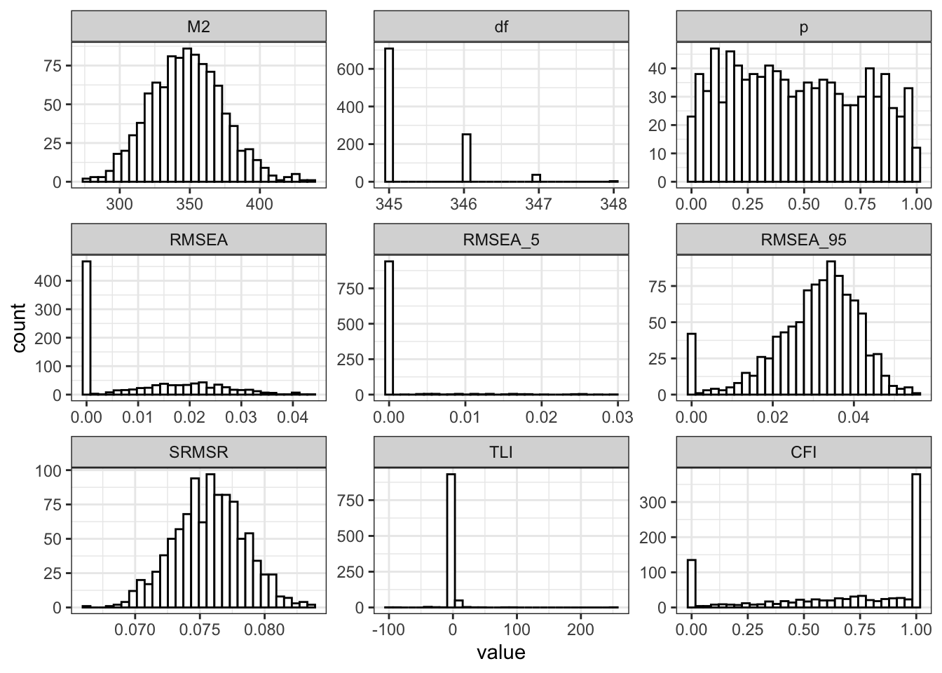 To visualise this, Figure 1 plots the distribution of each fit measure across replications. The spread is wide, especially for the incremental fit indices.